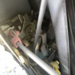 黄色とつながっているのがキーシリンダーです。ドアガラスを支える棒の奥にあるので取り外しが難しいのです。キーシリンダーは次の写真のような金具で固定されていますが、これの取り外しが結構難しいのです。狭いところで簡単にはとれませんでした。